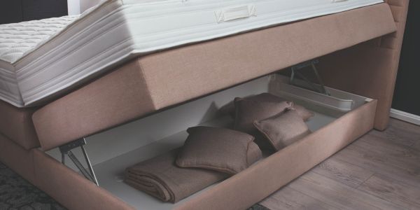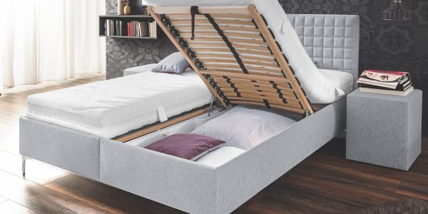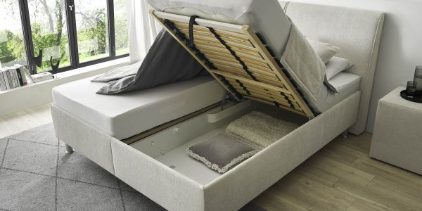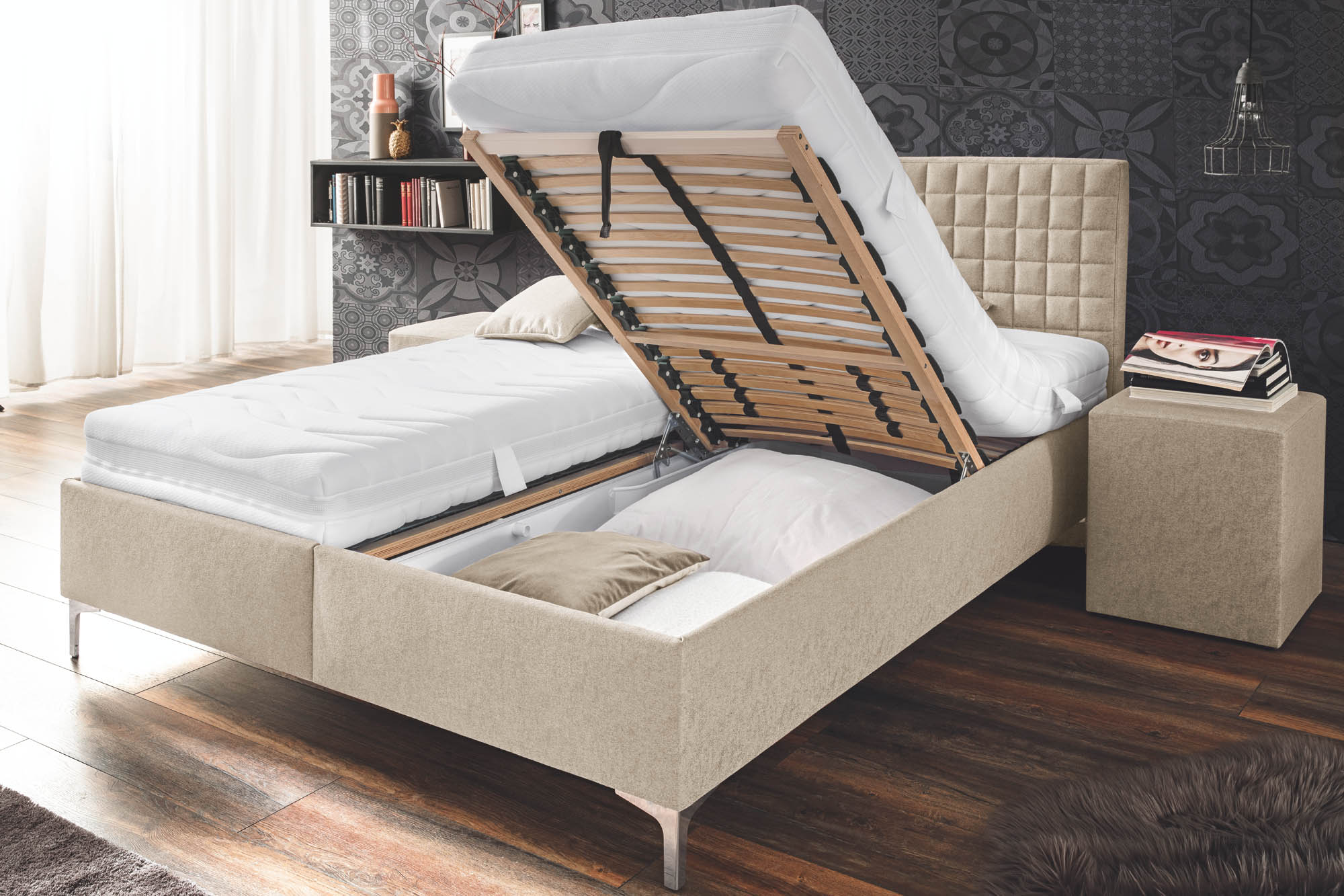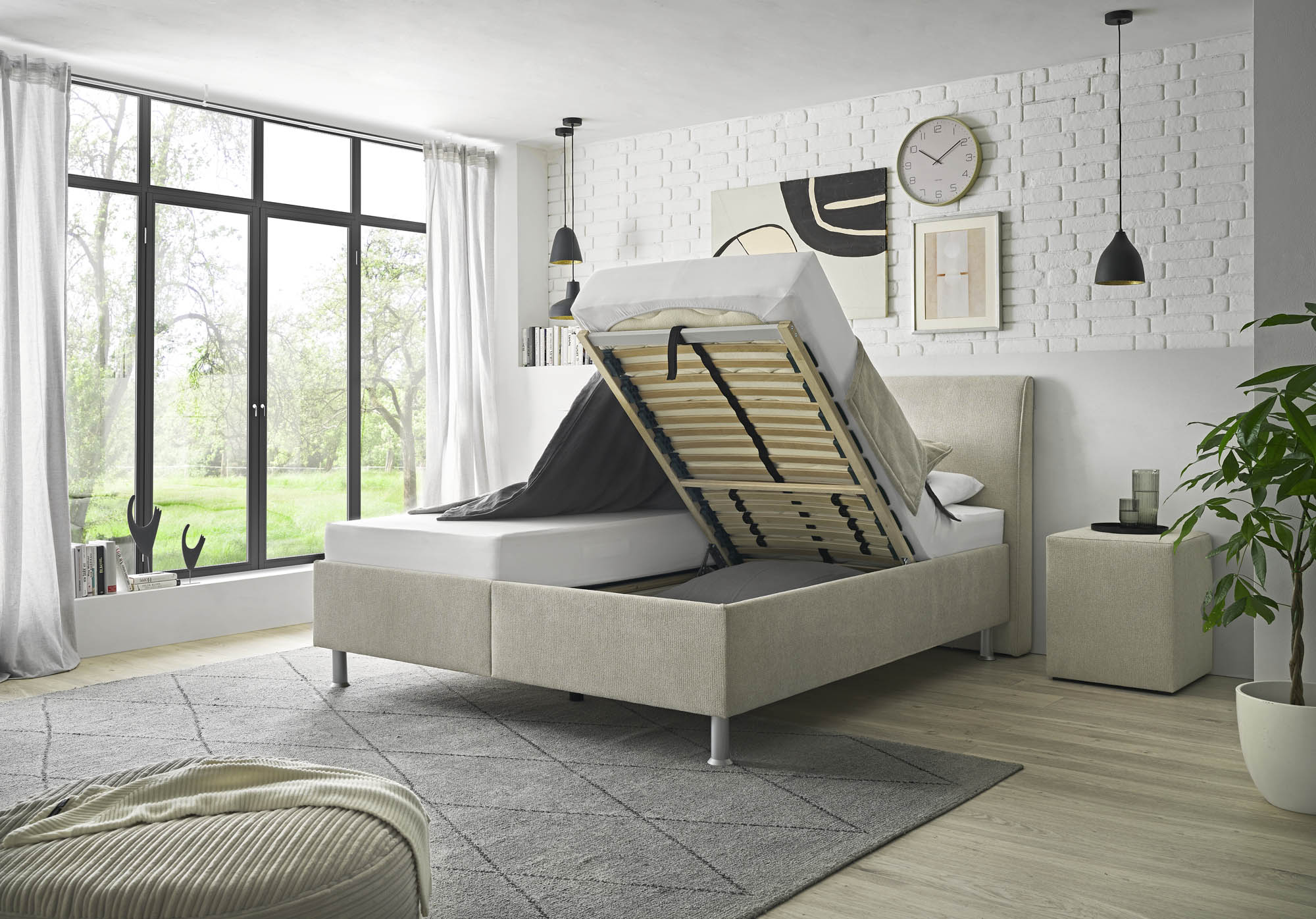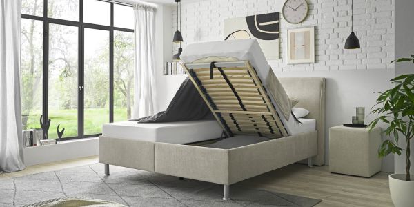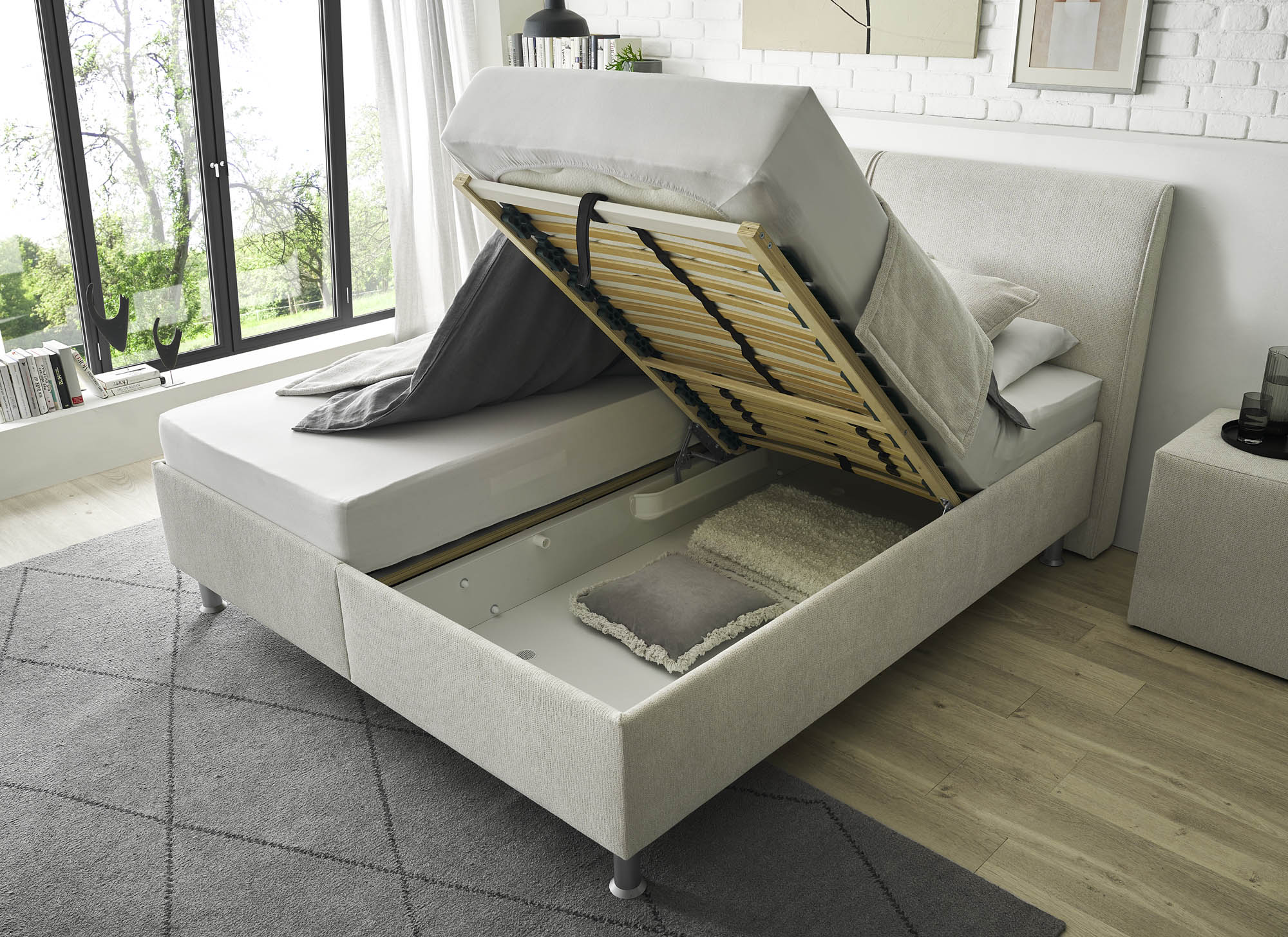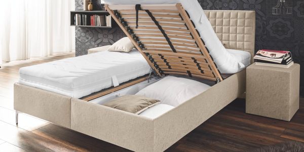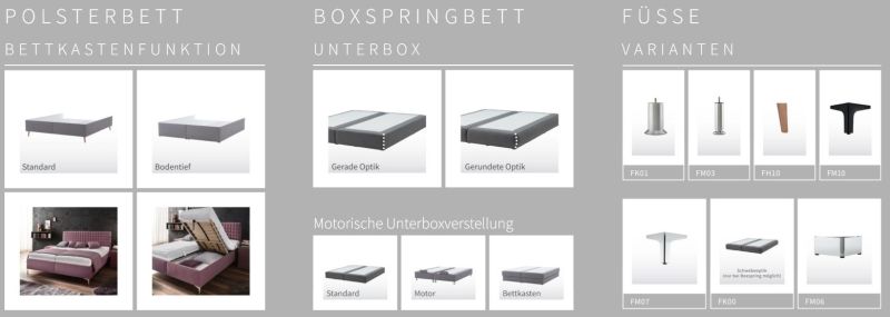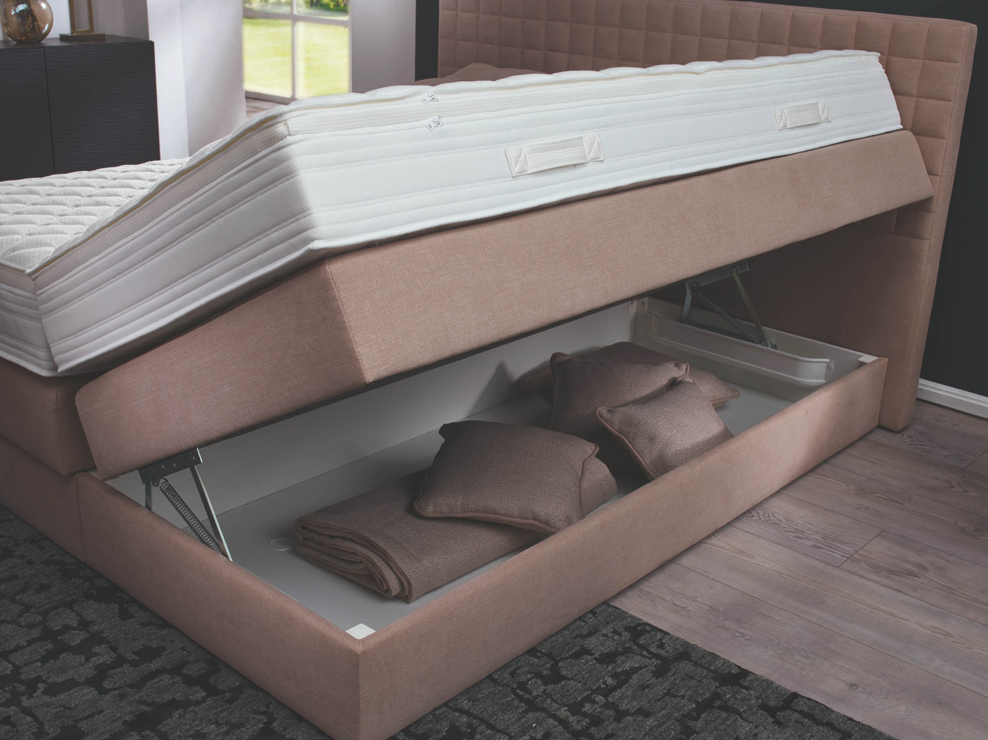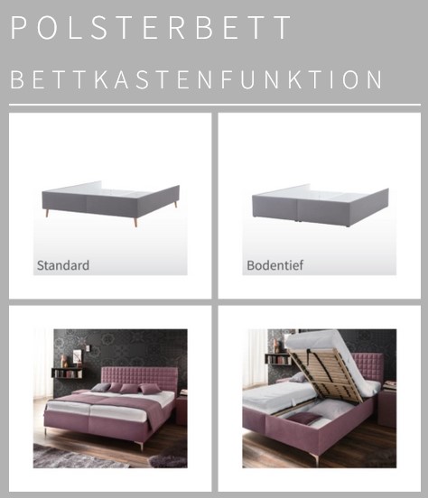 Der Bettkasten kann auf Füßen oder wahlweise bodentief bestellt werden. Die Stoffe können am Bettkasten auf Wunsch gerundet verpolstert werden. Optional ist eine Gasdruckfeder erhältlich, die den Zugang zum Stauraum vereinfacht. Es können aber auch elektische Lattenrahmen eingelegt werden (erschwerter Zugang zum Stauraum).