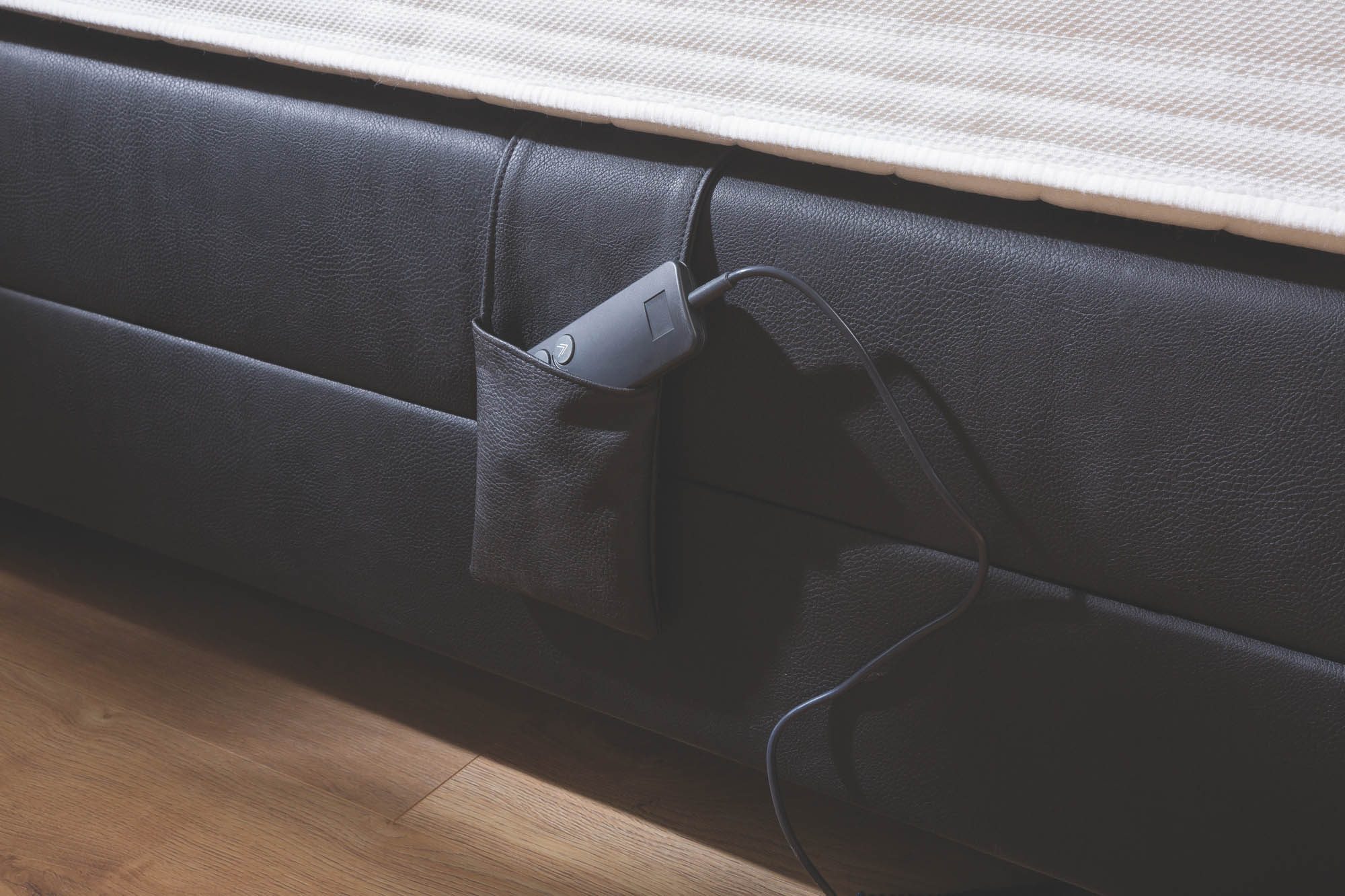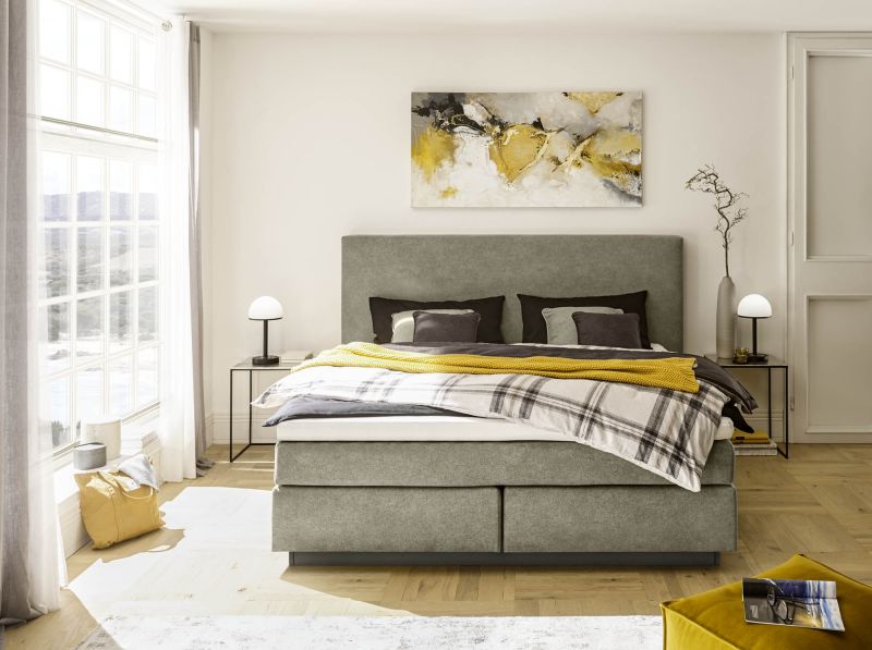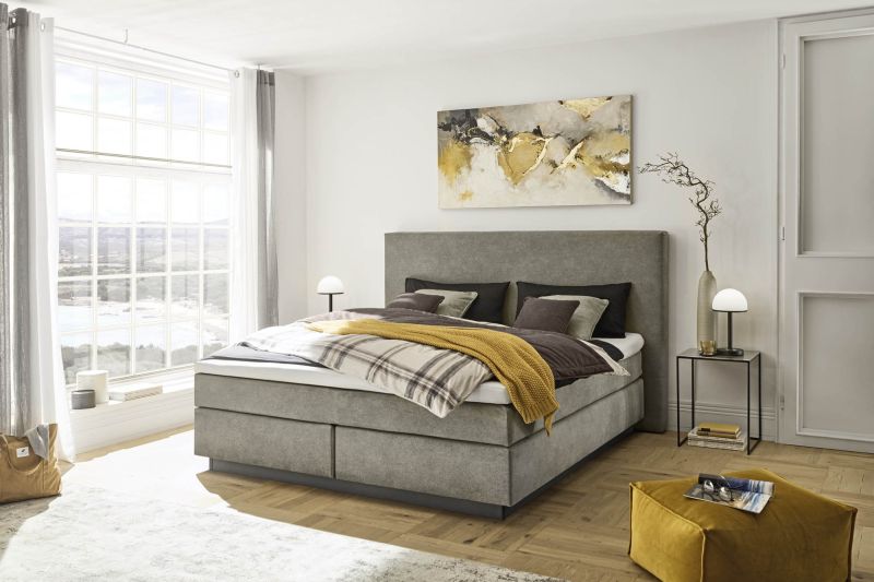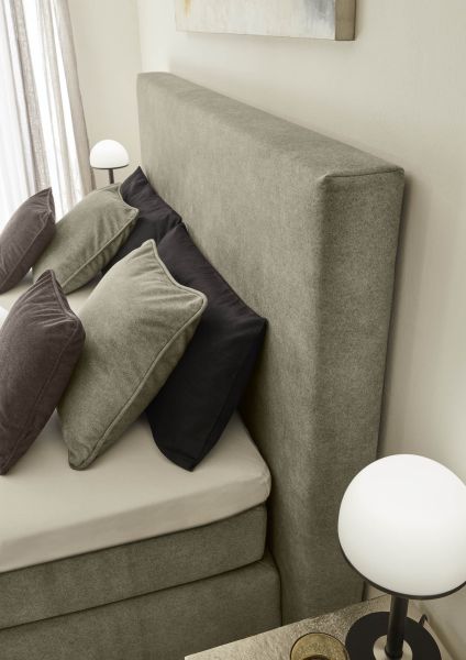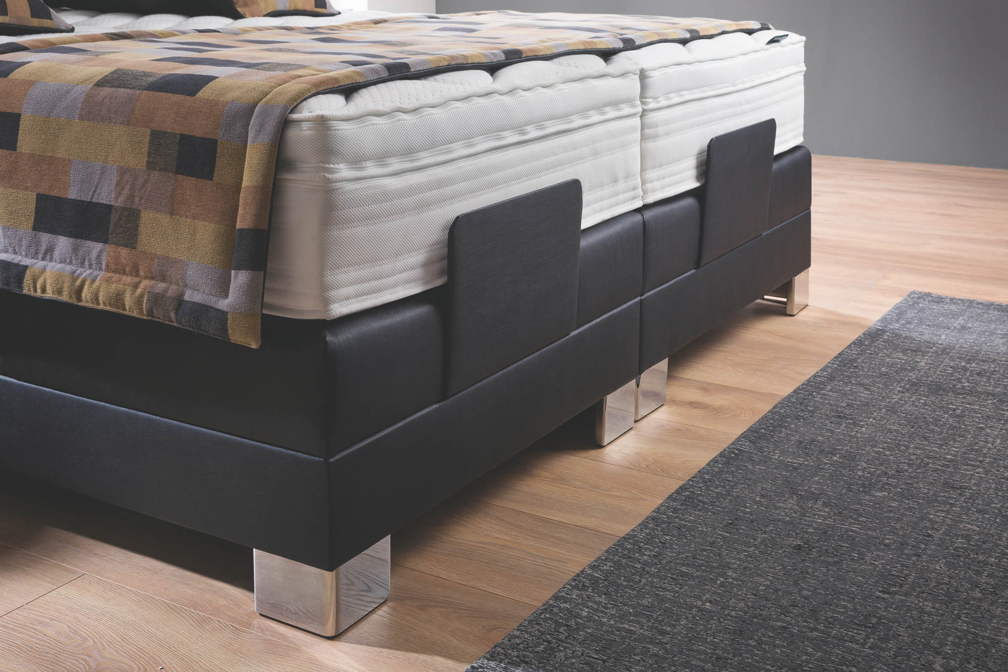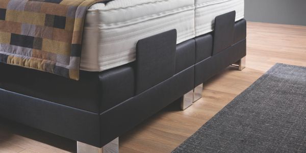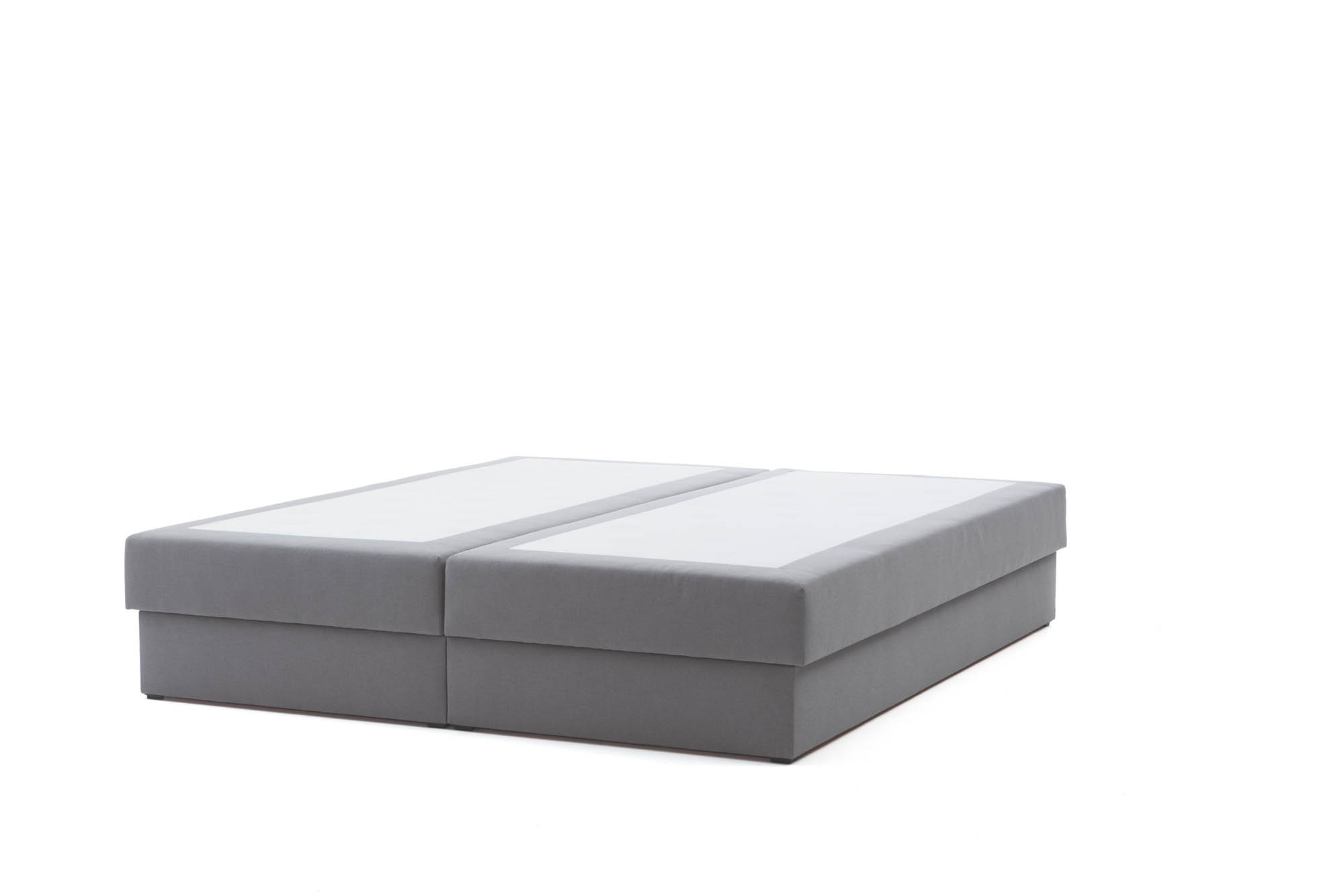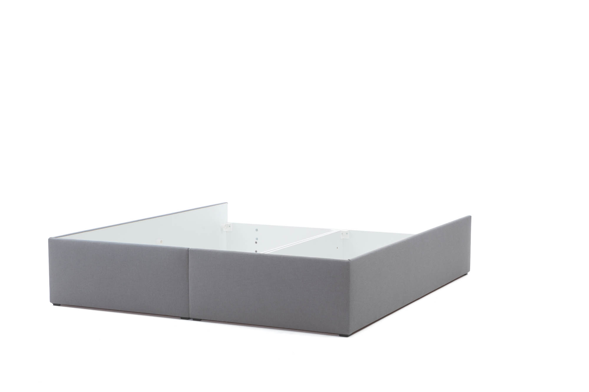 Die Box kann auf Füßen oder wahlweise mit einen geschlossenen Holzsockel bestellt werden. Die Stoffe können an der Box auf Wunsch gerundet verpolstert werden. Optional ist eine elektische Verstellung oder auch ein Stauraum bestellbar.