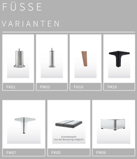 einem Kopfteil und den Kunststofffüßen FK01. Optional erhältlich sind unterschiedliche Kopfteile und Füße.